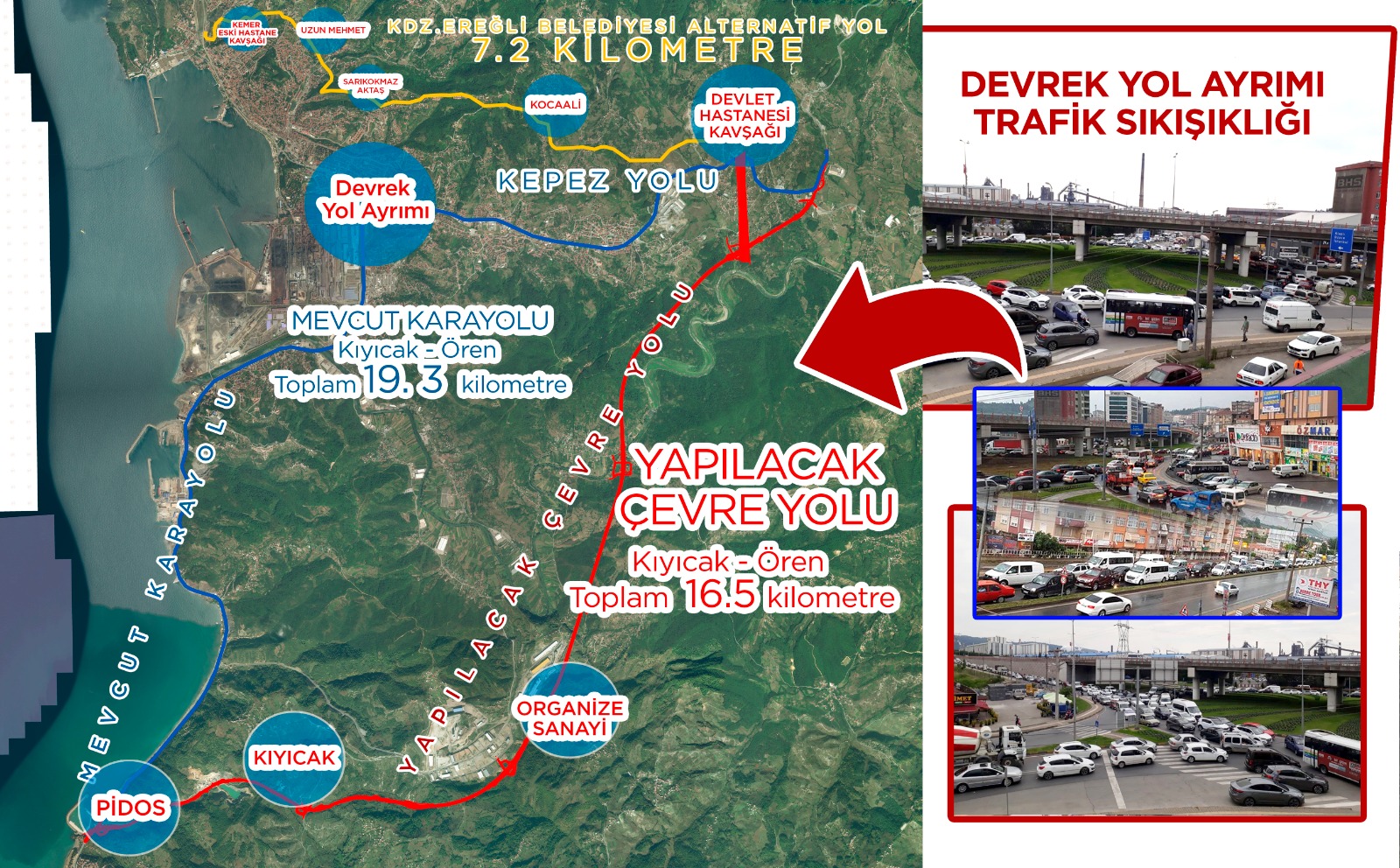 Kdz. Ereğli Belediye Başkanı Halil Posbıyık, kent içi trafik sıkışıklığının giderilmesi için ‘Çevre Yolu Projesi’nin mutlaka yapılması gerektiğini belirterek; “Bizim açtığımız alternatif yan yolları Karayolları ana yola bağlattırmadığı için Ereğli’nin en büyük sorunlarından biri trafik sıkışıklığı. Çevre yolu yapılırsa Karayolları kepez yolunu bize devredecek ve yan yolları bağlayacağız. Ayrıca bir kez daha çağrıda bulunuyorum. Kandilli Tepesi – Balı arasındaki orman yolunun mutlaka açılması lazım. Burası da Ereğli trafiği için bir bypass olacak” dedi.