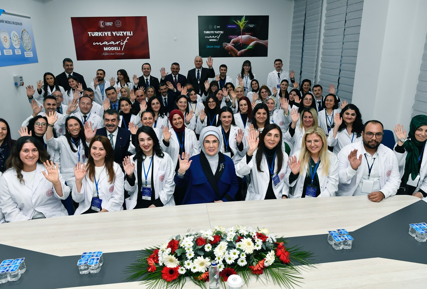 Emine Erdoğan ve Yusuf Tekin, öğretmenler odasında öğretmenlerle bir araya gelerek eğitim süreçlerine ilişkin görüş alışverişinde bulundu; özverili çalışmalarından dolayı öğretmenlere teşekkür ettiler.